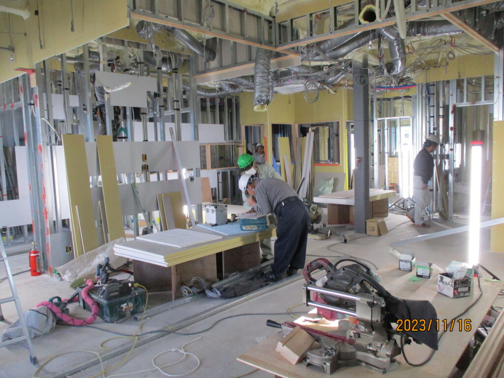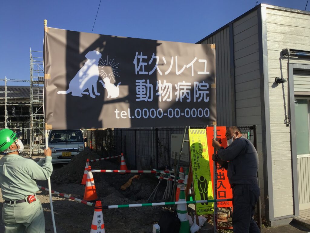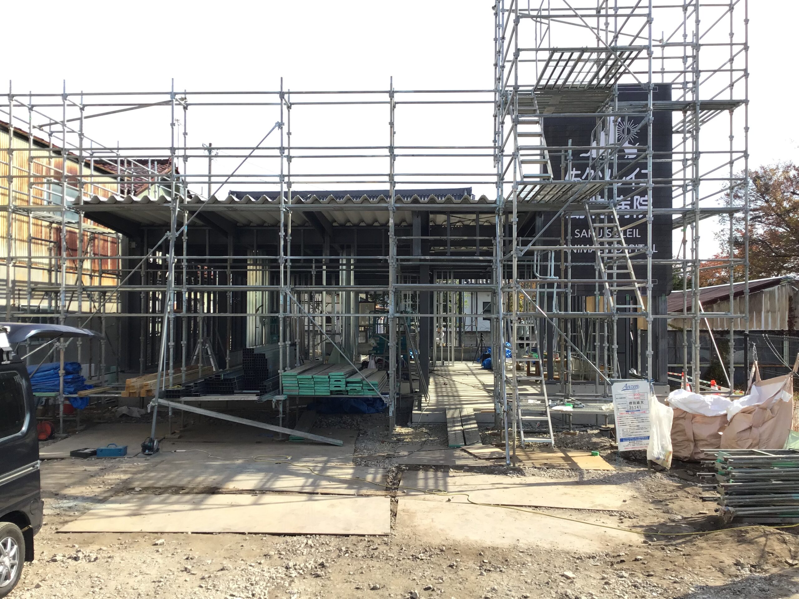 2023年11月17日(金) 動物病院 建て方完了ーーー初春に向けスパートです! 外壁サインのモックアップの様子ーーーーサイズ・バランス等の確認! 長くハネ出したヤネ庇がポイントーーー! 道路沿いの自立看板もモックアップで確認 ! 内装工事の状況ーーー待合から受付、診察室を望む!