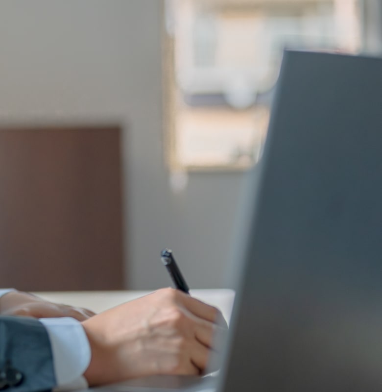 スーツ姿の人物が住宅模型の前で契約書に署名している様子