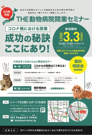 2021年8月10日(火) イベント 共催セミナー 【延期】新型コロナウイルス感染症が拡大している状況を鑑み、動物病院開業セミナーの開催を延期させていただくこと致しました。尚、延期となる日程が決定致しました際には、改めてご案内申し上げます。参加とご予定している先生方には大変ご迷惑をお掛け致しますが、何卒ご理解賜りますようお願い申し上げます。 【詳細】Vet Support Tokai(ベッツサポート東海)https://vet-support.jp/
